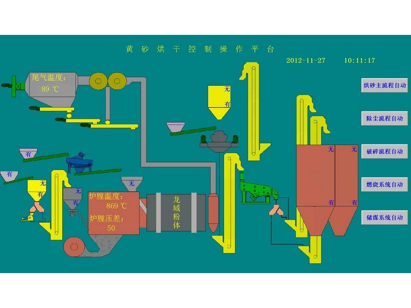 系統(tǒng)采用德國西門子PLC和研華工控機等國內(nèi)外尖端科技產(chǎn)品,工作現(xiàn)場的所有物料料位和所有物料開關(guān)閥門均采用現(xiàn)場實時動作監(jiān)控,并在工控機人機操作界面上同步顯示,現(xiàn)場所有物料及機械運動均在人機操作界面上采用動態(tài)顯示,畫面逼真,具有操作簡單方便、運行可靠、界面友好等特點。所有閥門的動作和電機均采用程序保護。